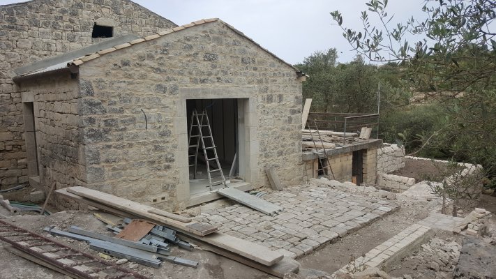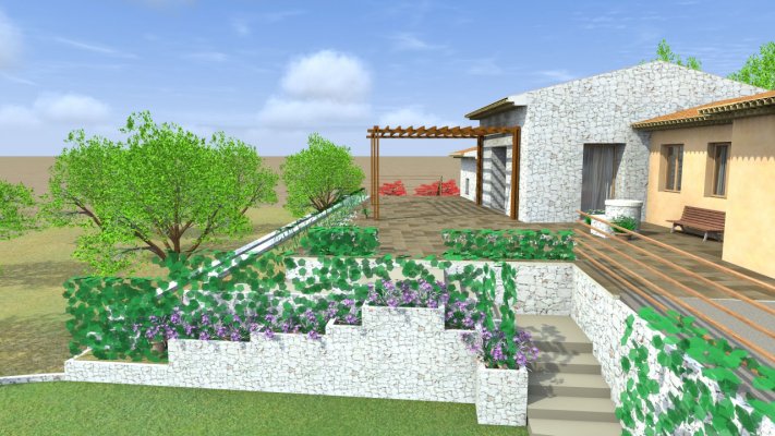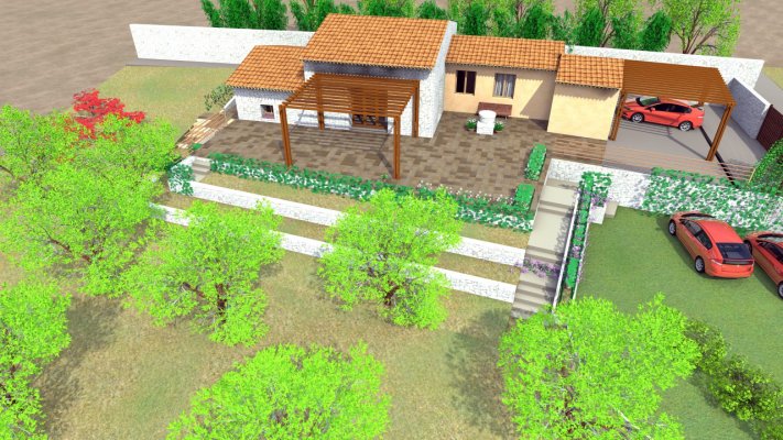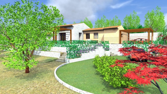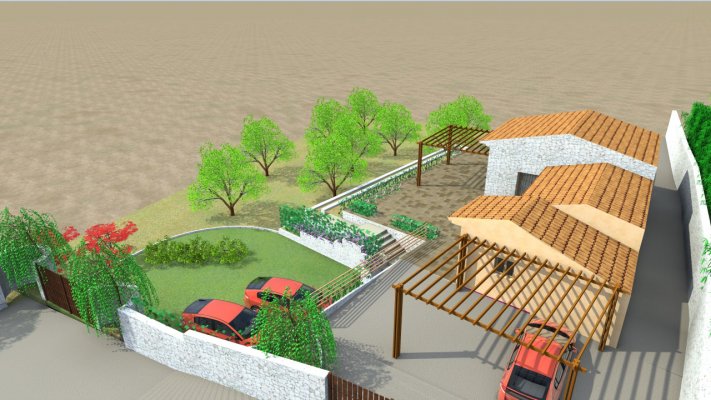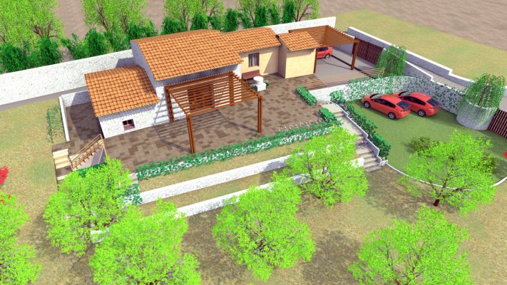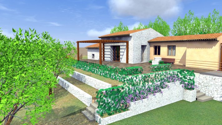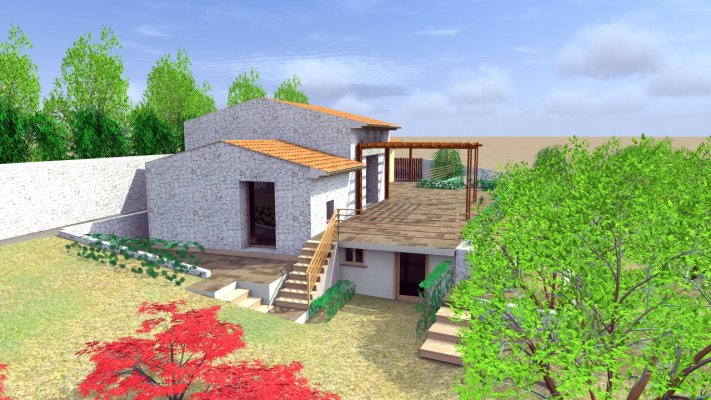 L’immobile è un casa singola con copertura a falde, articolata in più corpi di fabbrica, dalle diverse altezze della linea di gronda. Insiste su di un lotto di terreno in leggero declivio, delimitato da muri a secco e piantumato con alberature tipiche della macchia mediterranea.Il progetto di manutenzione straordinaria ha previsto il miglioramento sismico dell’intera costruzione, con il consolidamento dei muri portanti ed il rifacimento della copertura, la modifica di alcuni prospetti, l’inserimento della cappuccina nella linea di gronda dei tetti del prospetto principale, la modifica della distribuzione interna, la sistemazione degli spazi esterni e la realizzazione di una pergola a supporto dell’impianto fotovoltaico.Per quanto riguarda la sistemazione sterna, per colmare i salti di quota, tra il piano di campagna e la terrazza sono state realizzate dei terrazzamenti, e ridisegnata la scala esistente. Tale scala sarà arredata con aiuole piantumate, con essenze tipiche della macchia mediterranea. Verrà inoltre realizzato l’ingresso alla proprietà e disegnato il varco di accesso con l’inserimento di aiuole circolari, realizzati con pietra a spacco, a sostegno del cancello in ferro, piantumate con alberi ad alto fusto.